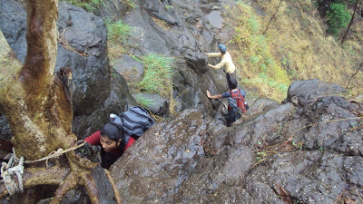 Once that is done, and we were on the other side of the rock from where again started a series of rock climbing patches. Very narrow space to stand, and very difficult rock patch to cross. Again our leader Amol, crossed it 1st, then Sonal and then Vidya. When we were watching these gals climbing up, boys behind me were like come one etna kya time le rahe ho, on which I did say that "Jyachi jalte tyalach kalte" ... and thats the fact. In the mean time I had decided where all I was going to keep my feet and how I will climb that patch. But after I started climbing that rock patch, I realised my planning didn't work.